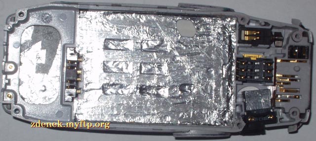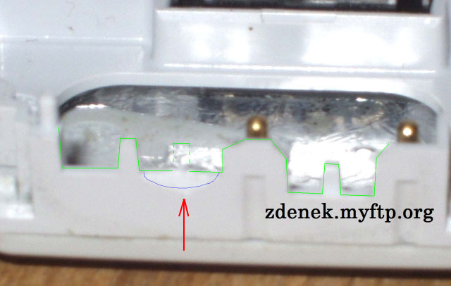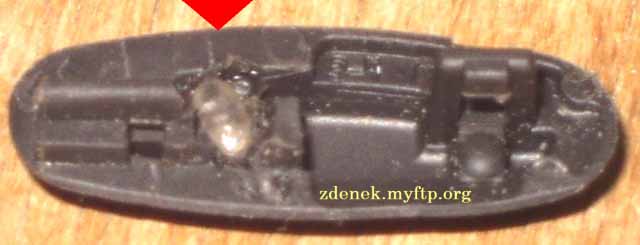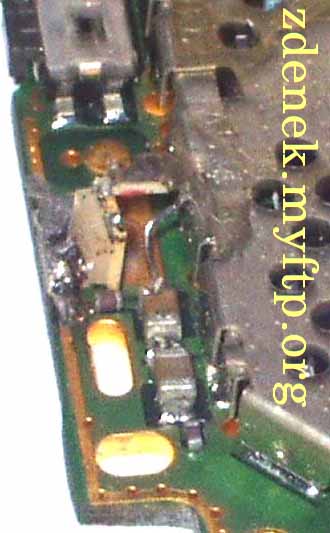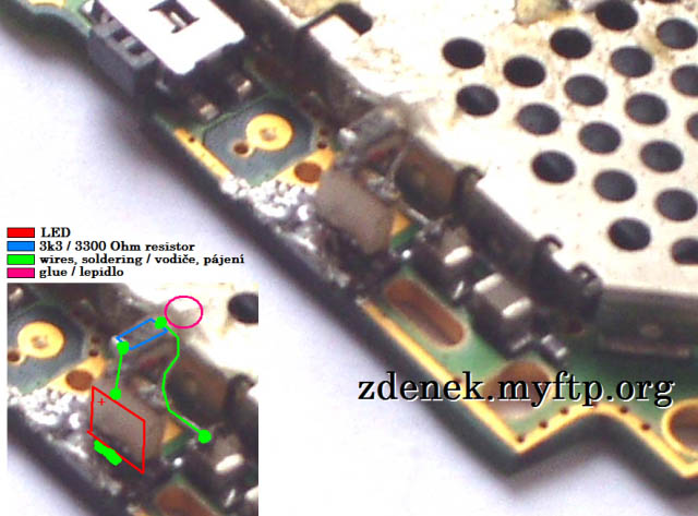 | Budete potřebovat: LED dioda velikosti 1206 (já jsem použil červenou) Subminiaturní SMD rezistor 3k3 (značený 332) Toluenové lepidlo (Styrofix, Butacel, Purocel, Kanagom...) (no dobře, i acetonové) Vlasové drátky 0,2 mm z ohebné šňůry Účinné desoxidační činidlo (Eumetol, MTL401) (v nouzi kalafuna) Páječka (nejlépe mikro s termostatickou regulací teploty) Sn61Pb Nůž Šroubovák schopný si poradit se šroubky Torx 6 Líh (i denaturovaný) Děrovač kůže 1.8 mm (lze improvizovat naostřenou trubičkou z náplně do propisovačky) Nejdřív telefon rozšroubujte (kryty máte dole) a měl byste v podstatě vidět tyto díly:  (Chybějících krytů nahrazených Al si nevšímejte, o odtučňovací kúře zase jindy).  Zaměřte se na toto místo:  Nožem oškrábejte zelený lak na naznačeném místě, kam se připájí dioda:     Prostudujte následující schéma a připájejte LED diodu katodou dolů. Rezistor s jednou stranou opatřenou tenkým drátkem (za který ho přidržíte na místě) si připravte stranou. Pak spájejte volný konec rezistoru a anodu LED. Drátek ohněte k blokovacímu kapacitoru, jak je vidět na fotografii. Zkraťte.  Povšimněte si, že v místě lepidla se rezistor nedotýká stínicího krytu!!! Lepidlo zabrání ohnutí a ulomení a zajistí izolaci případného dotyku. Nyní je třeba přizpůsobit také průchod světla z telefonu ven. Vezměte chassis a nožem uřízněte ten správný výstupek umělé hmoty. Je jich tam několik, tak vezměte ten správný!!!  Děrovačem udělejte díru do gumového tlačítka. Je vhodné si vše podložit tvrdším dřevem, ale ne zase tvrdosti umakartu. Na obrázku vidíte díru již osazenou polykarbonátovou tyčinkou :-)  Nasaďte tlačítko zpět do chassis. Průzor padne přesně do místa výřezu.  Zde je pohled na tlačítko z vnější strany. Do polykarbonátové tyčinky svítí slunce, proto se jeví bíle.  Za pozornost ještě stojí odlehčená verze antény,  která vypadá zevnitř (s alobalovou fólií místo nerezového plechu) takto:  To je konec návodu. Ať se vám telefon ještě někdy podaří zapnout! :-E) Pokud jste nekápl cín na PCB ani neuvedl rezistor do zkratu, vše by mělo šlapat na první zapnutí. Jo a eumetol umyjte líhem! Namočení do lihu plošnému spoji nevadí. Mnoho zdaru! Případné dotazy rád zodpovím. |