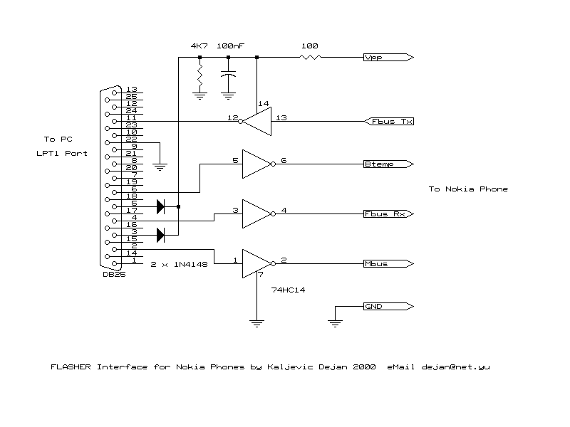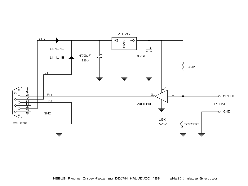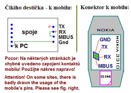 - MBUS/FBUS kabel. Doporučuji koupit si tento kabel vcelku, s výhodou tak dostanete i správný konektor pro připojení k mobilu. Navíc je o něco složitější na výrobu a dá se líp sehnat. Nicméně tady je schéma.